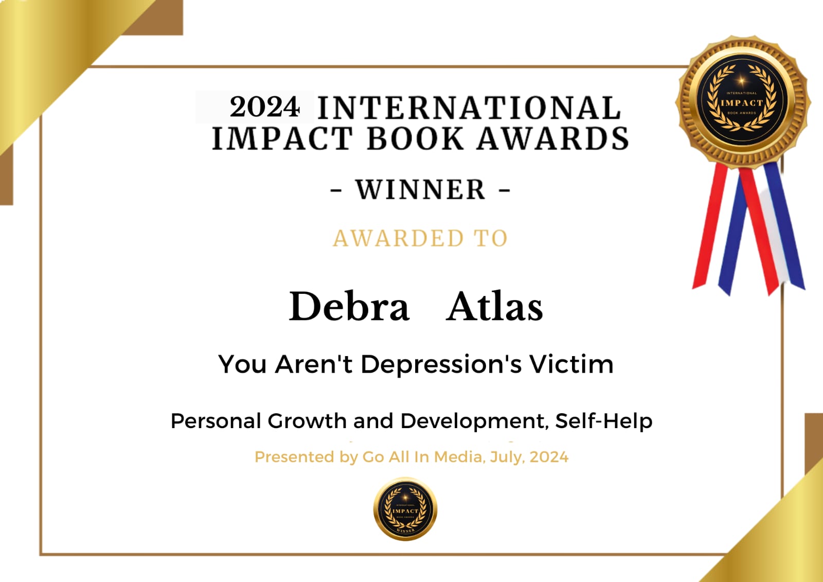 Debra Atlas has been awarded 2024 International Impact Book Award for “You Aren’t Depression’s Victim“, in the category of Personal Growth and Development, Self-Help. This accolade celebrates her profound contribution to helping individuals overcome depression and empowering them to reclaim their lives.